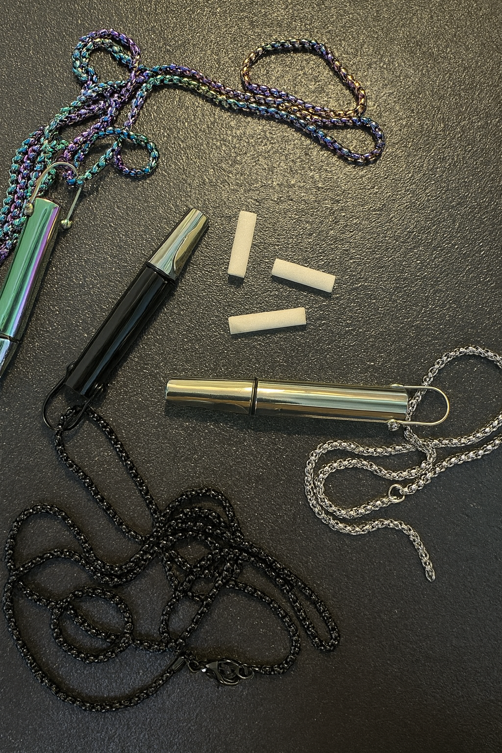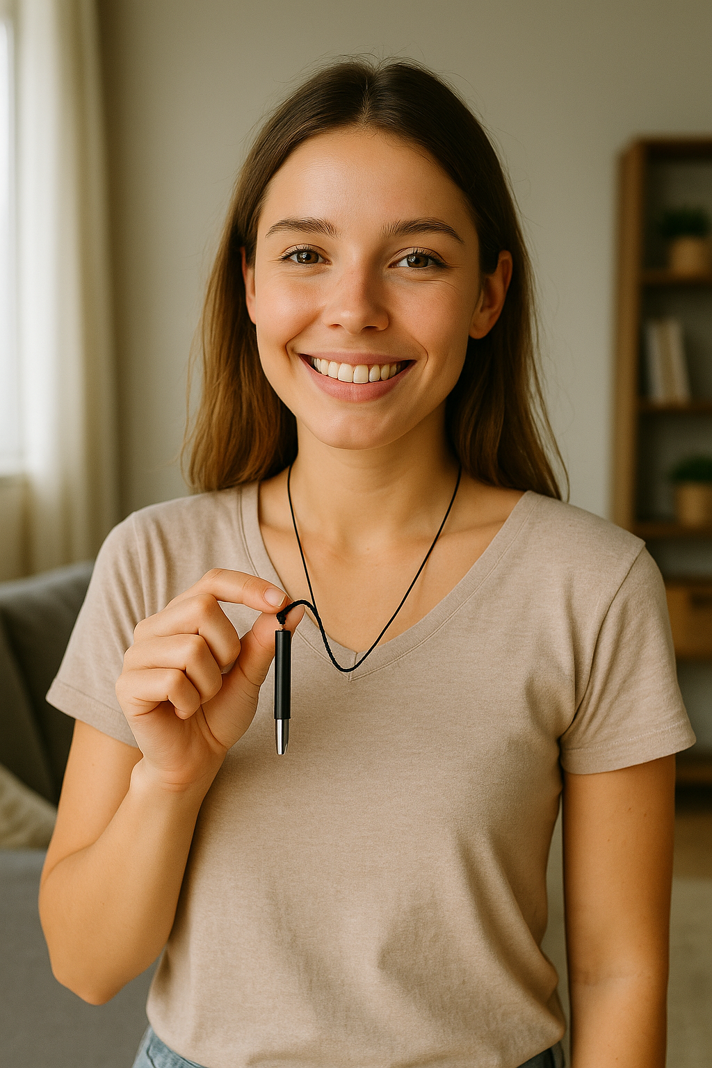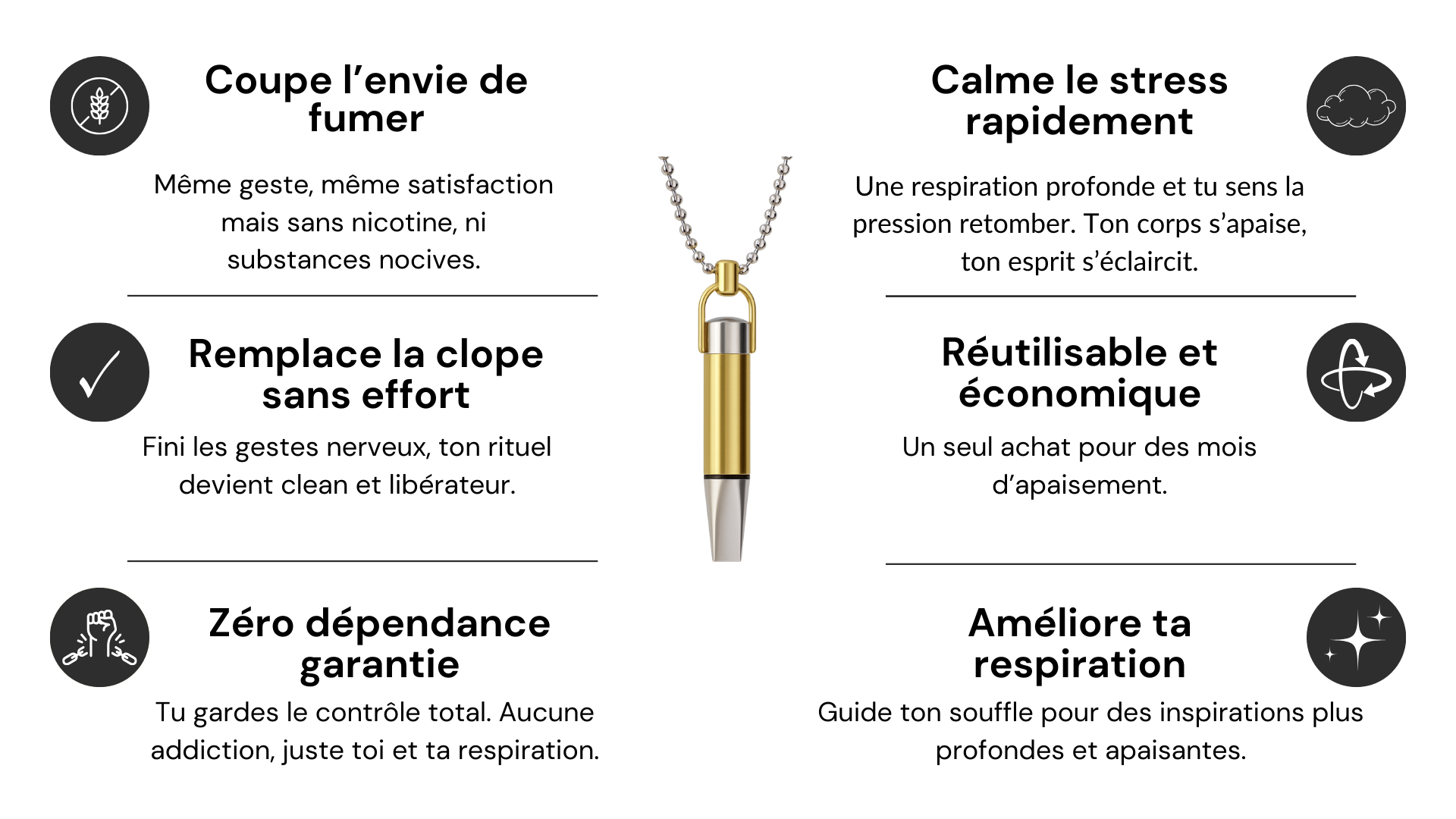 En expirant dans le collier, tu ralentis naturellement ta respiration. Résultat : ton corps se calme, ton esprit se pose… et l’envie de fumer ou de stresser redescend.
